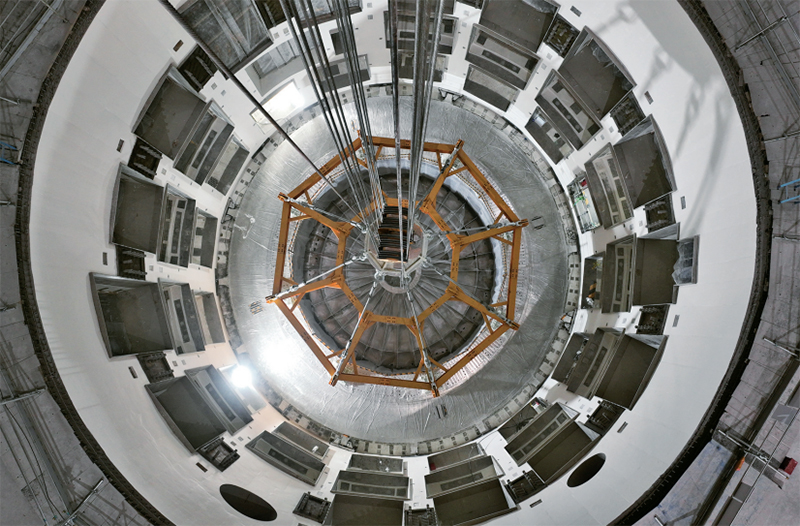 2025年10月1日上午,位于安徽合肥未来大科学城的紧凑型聚变能实验装置(BEST)主机首个关键部件——杜瓦底座成功落位安装,标志着项目主体工程建设步入新阶段。该装置建设的稳步推进,对于我国率先开展前沿聚变科学研究、验证未来聚变堆关键技术、持续引领国际聚变能发展具有重大战略意义。图为在装置建设现场拍摄的杜瓦底座(无人机照片)。 新华社记者 周牧/摄