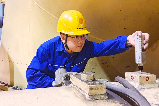 图为发电部电气巡检员测量发电机震动。