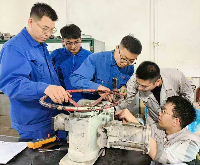 图为设备部电气班人员对损坏设备进行维护保养。