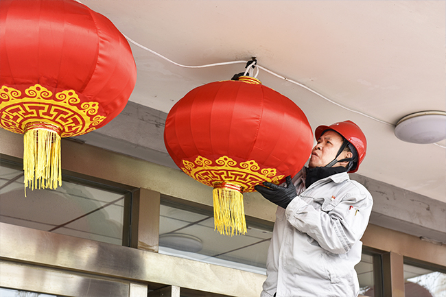 春节临近,中央机厂启动了节日亮化工作,扮靓厂区夜景。伴随着升降机隆隆的声音,一个个红灯笼、一串串彩色藤球灯、一条条流光的灯带正在被工人师傅们挂上树梢。大厅的玻璃窗前,女工们正在张贴一幅幅红彤彤的“福”字,让人眼前一亮,满目尽是喜庆的“中国红”,年味儿十足。通过不同元素的打造,进一步丰富了员工群众的文化生活,营造出欢乐、喜庆、祥和的节日氛围。