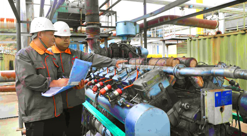 太原煤气化沁城煤业公司牢固树立绿色环保理念,扎实推进瓦斯发电项目建设,将井下本煤层预抽系统和采空区抽采系统抽出的瓦斯输送至地面发电厂,将电能最终经架空线路接入国家电网,真正实现“化害为利”。图为现场工人检验瓦斯发电机组运行状况。