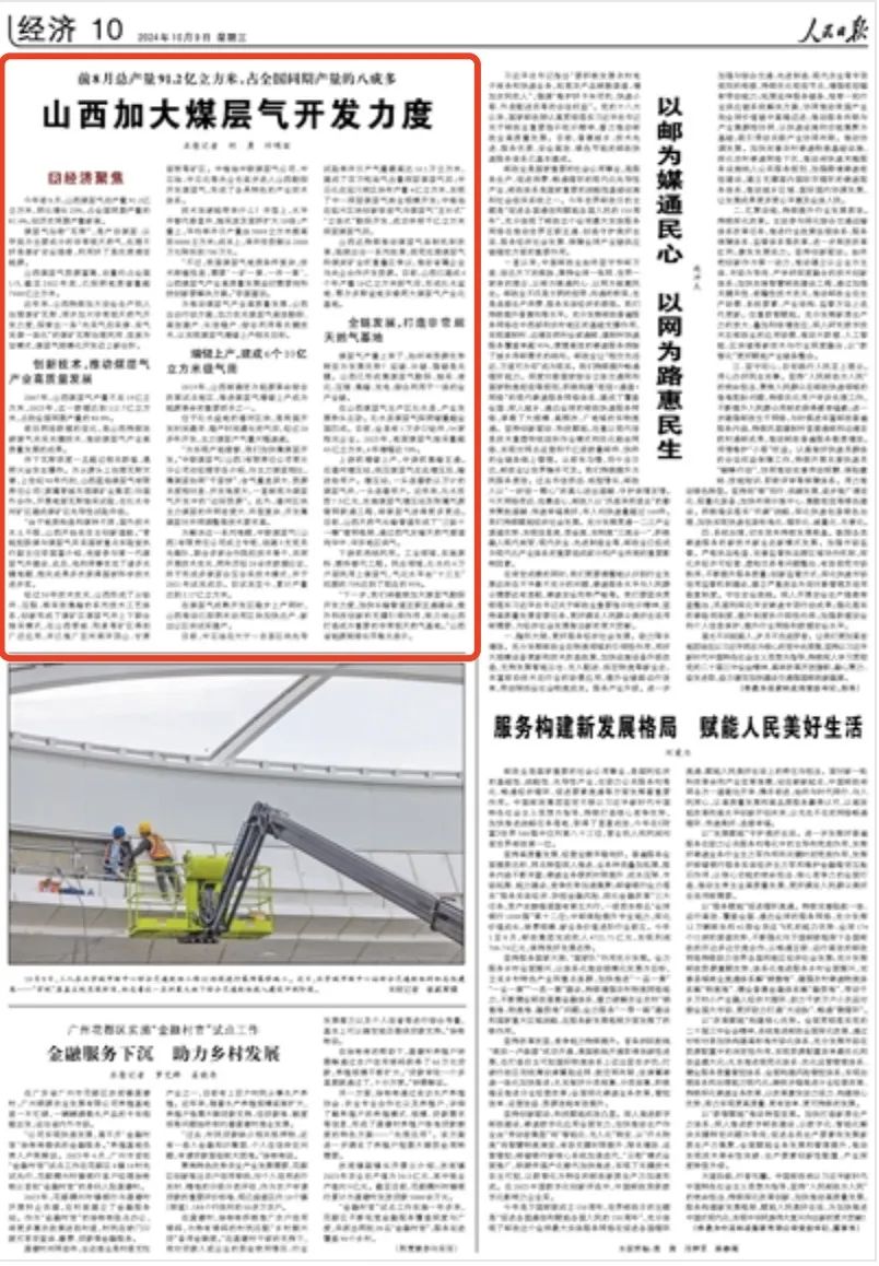 2024年10月9日,人民日报以《山西加大煤层气开发力度》为题,报道了山西持续加大安全生产投入治理煤矿瓦斯,同步加大非常规天然气开发力度,探索出一条“先采气后采煤、采气采煤一体化”的煤矿瓦斯治理利用、变废为宝模式,煤层气规模化开发迈上新台阶。这是山西持续突破煤气共采关键技术、推动煤层气产业高质量发展的成果。