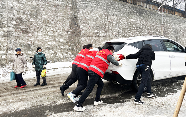 “小伙子,帮帮忙,我车上不去坡了”,一位私家车司机向大家寻求帮助。此时,志愿者们一拥而上,“师傅,轻踩油门,慢点走”有人指引司机,有人拿着铁锹清理车辆前面冰雪,有人在后边用力推,不多时,帮助私家车顺利通过。