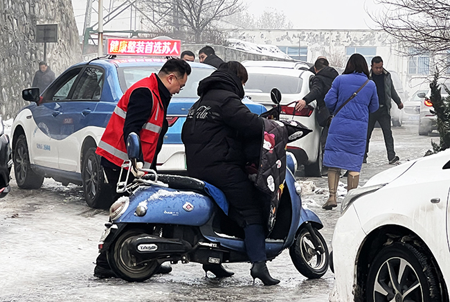 一场大雪,导致王台铺矿门口的陡坡湿滑结冰,路过的车辆打滑难行,路段压车严重。远远看去,有“一抹红”正在推行上坡困难的车辆。原来,为了保障行车安全,宇光公司销售中心动员员工自愿成立应急救援小队,主动清理道路积雪,帮助因路面积雪导致车辆打滑、上坡困难滞留半坡难以起步的车辆。