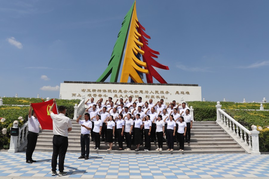 之后,大家在绿化丰碑下,面向党旗集体进行宣誓,表明永远跟党走的坚定决心。