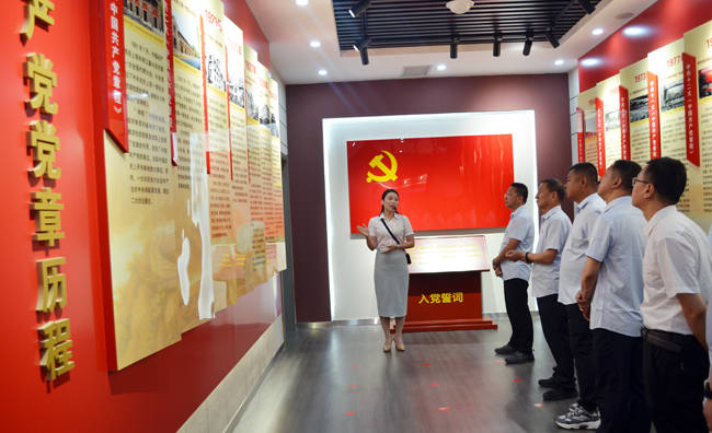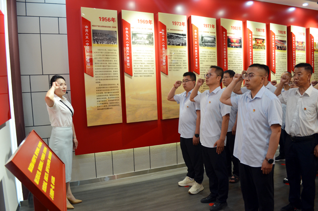 在宣誓厅,面对党旗,全体人员举起右拳,一起重温入党誓词,重忆入党初心,在铿锵有力的宣誓中表达出守纪决心,许下严守党的纪律、对党绝对忠诚的庄严承诺。