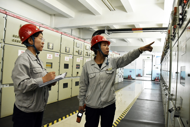 “测完电柜温度后,再看下电流趋势图,是否在正常范围内波动。”国庆假期期间,走进金象公司110KV变电站,只见当班班长曹弯弯和运行主操张姗姗像往常一样正在测量各台高压电柜的温度,她们每测量一个数值,都经过读数、复诵、填写、检查环节,确保准确无误。