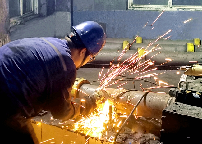 抢修就是和技术较量、与时间赛跑。迅速停运设备后,员工克服管道泄露点所处位置狭小、天气寒冷等困难,逐步清理故障点、打磨切面、焊接裂口……一系列操作迅速完成缺陷处理,避免了管道裂缝进一步扩大,确保设备正常运行。