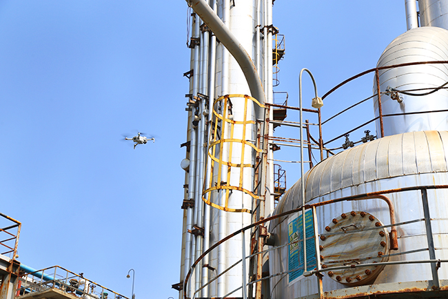 为促进值飞程序规范化,该公司从生产运行处、机械动力处、安全监察处和党工部中各抽选一名员工成立无人机操作小组。无人机投入使用后,及时发现塔顶平台存在锈蚀、管道保温缺失等隐患问题,为安全生产提供了保障。