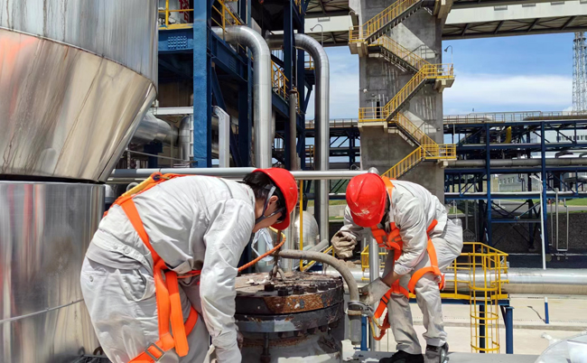 为确保生产系统稳定运行,湖北晋控气体公司机修人员持续加强设备日常检修维护工作,克服高温酷暑等不良因素影响,在确保现场安全作业条件下,圆满完成合成装置区废热锅炉检修作业。图为工作人员正在为合成装置区废热锅炉顶部人孔更换垫片。