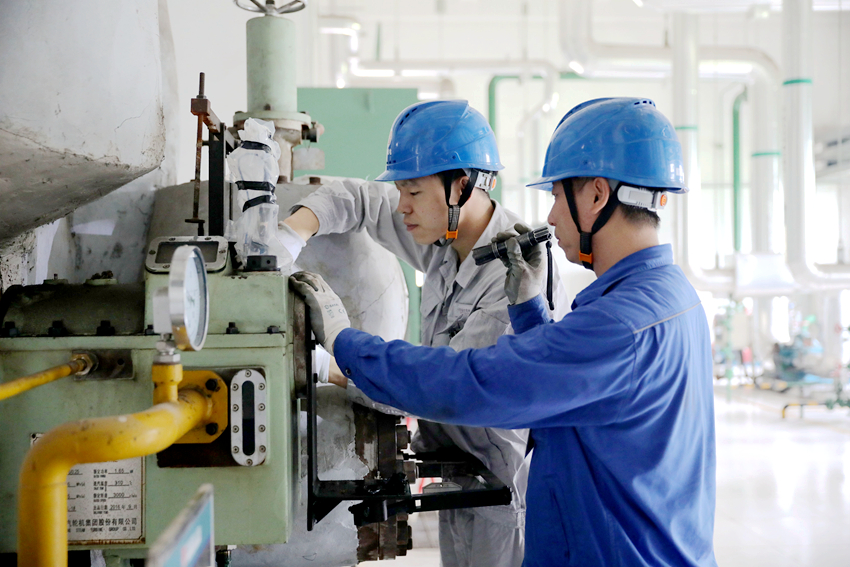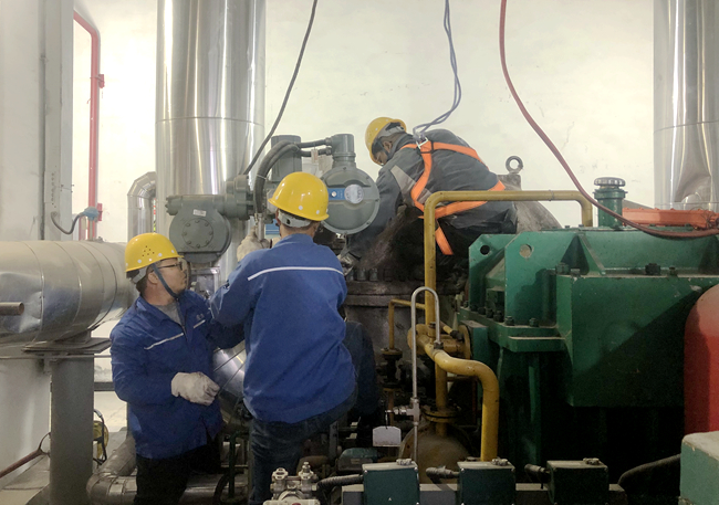 为保障供热设备在供热期安全平稳运行,河津发电分公司早谋划、早部署、早行动,有序开展供热设备检修工作,及时全面消除设备缺陷,确保机组在供热期间为用户提供源源不断的“暖流”。图为检修人员正在维护供热系统。