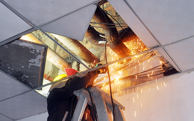 在抢修现场,该公司作业人员严格执行安全操作规程,头戴安全帽,身着工装,手戴防护手套,借助金属梯架登临吊顶作业区域。随着焊接设备启动,弧光与火花在管道与砖墙之间跃动,作业人员按照焊接工序精准操作,对供水管网进行加固修复。地面安全员紧盯施工细节,全程保障作业安全。