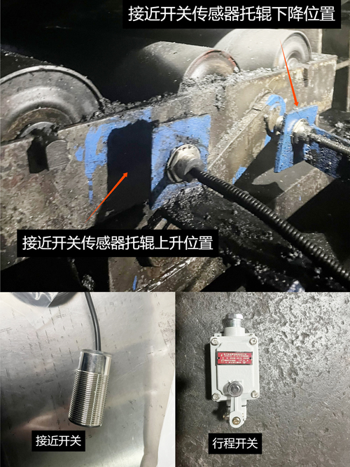 该公司产品仓内的精煤或原煤通过汽车快装站进行装车外运时,需要开启仓下545火车装车皮带,并通过犁式卸料器将仓内的煤卸入搭接皮带后转载至汽车装车皮带。由于汽车快装站装车较为频繁,而卸料器关键部件活动托辊组升降传感器使用的是LX5行程开关,此开关长时间切换碰撞后,容易损坏滚轮及弹簧片,导致无法驱动触点或操作头偏差,不能与部件碰撞,到达指定位置时不能停止,同时卸料点环境潮湿、煤尘较大,易造成托辊组行程开关失灵、自动下降或不动作等故障,影响装车皮带的安全稳定运行。