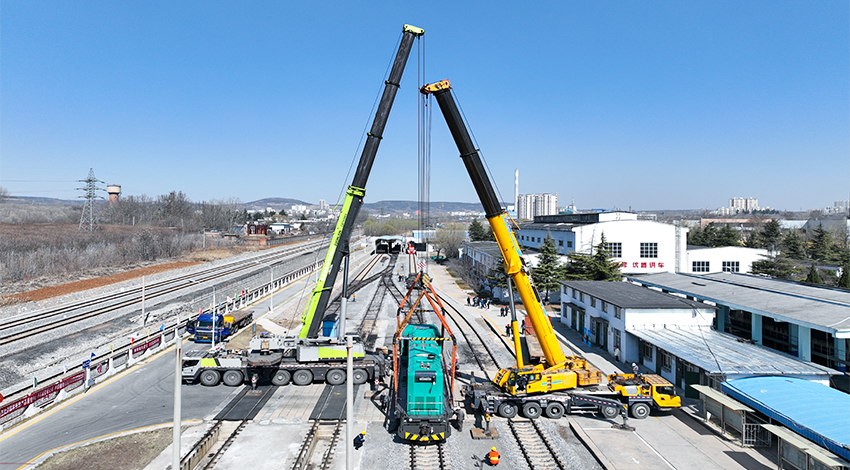 检查现场,两台吊车分置于混动机车两侧进行吊装作业,机车凌空吊起后推出转向架,同时推入工艺转向架落车,落车完成后调离机车和转向架,入库进行各系统拆解检查作业。