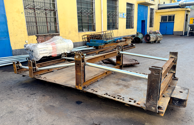 该公司机修厂多次到回撤工作面进行现场调研,设计制作了专用装车平台架。该平台架采用高强度工字钢结构,在原有平板车的基础上,按照支架拆解规格设计了可调节装车装置,平台表面焊接可调节支架装置,底部精准开孔,用螺丝固定在平板车上,两侧设置护栏精准打孔,保障支架装车后稳定安全,使支架能够平稳安放到运输车上。