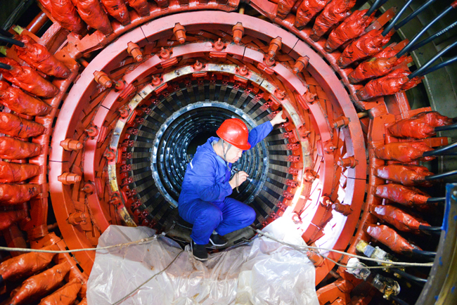 日前,同华发电公司#2机组B级检修工作正如火如荼地全面推进中,此次检修时间紧、项目多、任务重,为确保检修顺利进行,他们严把现场安全、质量、进度三大关卡,紧锣密鼓、扎实有序推动检修整体稳步进行。图为检修人员对#2发电机定子内膛端部线棒进行认真检查。