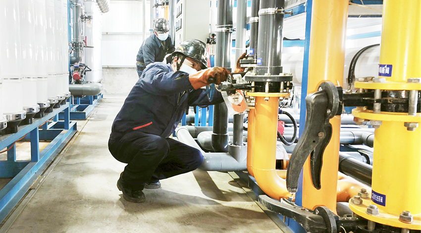 黄山煤业公司锚定“生态优先、绿色发展”目标不动摇,持续强化矿井水环保治理,压实管理责任,铁腕监督考核,保障环保设施稳定、规范、高效运行。公司将经过处理、化验达标的矿井水广泛用于井下生产及矿区绿化,实现经济效益、生态效益“双丰收”。图为机运队员工正在维护矿井水处理系统。