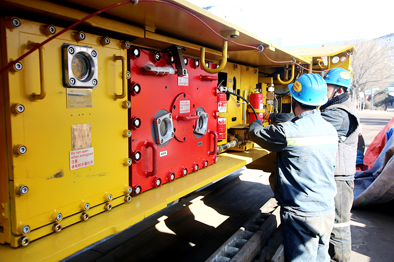 图为综采队员工检查大修后的综采设备准备入井。