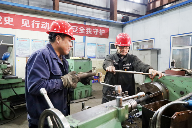图为该公司机修厂“党员先锋岗”正在二次加工零配件。