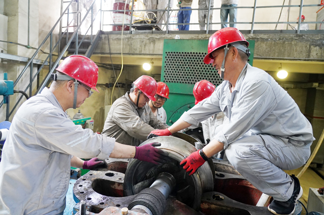 同承、同达热电公司围绕生产经营任务,将各项指标分解细化到月、到人,逐项制定工作措施,细化管理,明确责任,狠抓落实。规范设备精细检查,减少缺陷发生,做到把“耗”降下去,把“效”提上来。图为运行人员正在对给水泵进行技术改造。