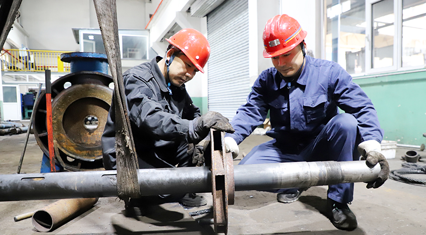 神州煤业公司立足企业生产经营形势,牢固树立成本管控理念,紧密围绕“固强补弱、三提一降”工作主题,深入挖潜增效,通过加大修旧利废力度,延长井下设备使用周期,节约采购成本,从细微之处助力企业降本增效。图为该公司专业技术人员正在对井下回收的离心式水泵零部件进行检修。