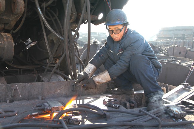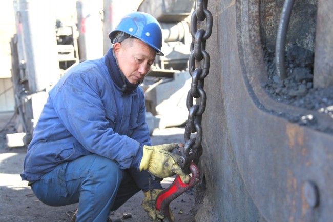 在液压支架拆解现场,员工们顶着大风连续作战,遇到被冻的零部件,按工艺流程先进行合理加热,消融冰冻点,再用锤头、扁铲、铁钎等工具进行拆解。十一月底的大同,室外温度达到零下十几度,早已伸不出手,更别说每天都要和冰冷的铁器工具“亲密接触”,但他们严格遵守安全操作规程,抡锤过程中坚决不戴手套,实在冻得不行就把手放在嘴边哈几口热气缓解一下或者将手交替放在腋下、跺几下脚暖和暖和,然后接着再干。就这样,他们在户外常常一干就是几个小时,有的人手上被冻出了大大小小的裂痕,但没有一个人叫苦叫累。当问到他们为啥要这样拼时,其中一个老工人笑着说,打进厂时他的师傅就常念叨着一句话:厂兴我荣、厂衰我耻。如今他也成了老师傅,也要用实际行动影响带动身边的年轻人要发扬优良传统,时刻牢记自己是“中央机厂人”,按时完工是他们最大的心愿。