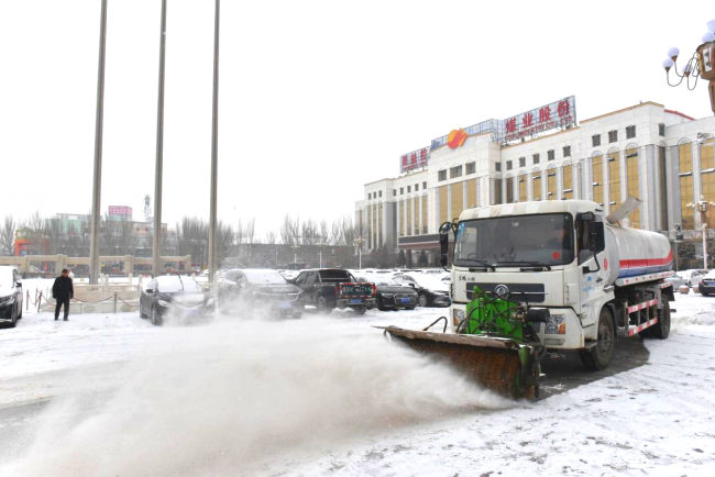 环境卫生大队除雪车在煤业集团办公楼开展清推积雪作业