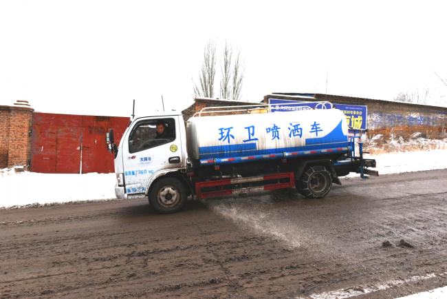环卫大队融雪洒布车在五九公路开展喷洒液体融雪剂作业