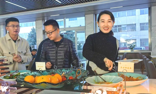 春节前夕,公司食堂充分准备外带食品,增加供应频次,满足职工节日餐桌需求,丸子、酥肉、烧鸡、炖肉、饺子馅、红烧鲈鱼等30多种熟食品类供应充足,吸引了不少职工前来选购。