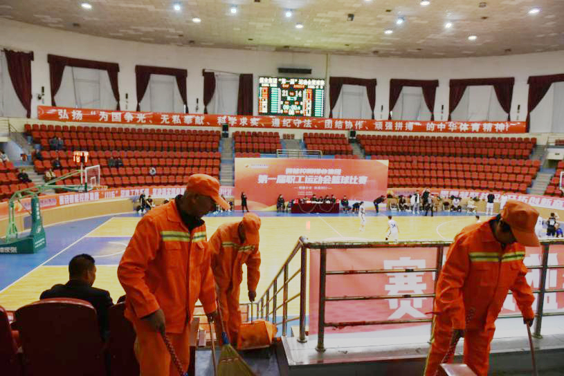 在晋能控股煤业集团第一届职工运动会篮球比赛开赛之际,场馆内外的保洁服务工作也在紧锣密鼓、有条不紊地进行着。