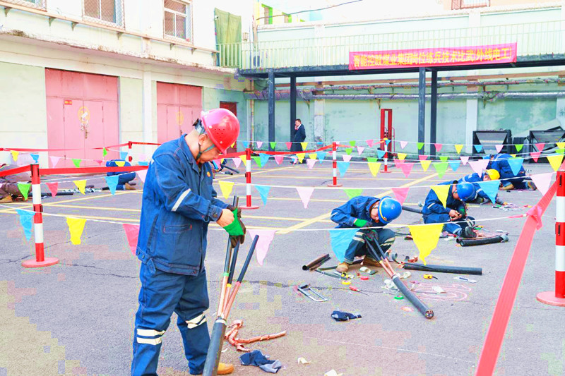 外线电工技术比武的选手们身着工作服、绝缘鞋,头戴安全帽,有条不紊完成10kV交联聚乙烯电缆户外冷缩终端头制作的每一个步骤,展现出了扎实的专业知识和丰富的实践经验。