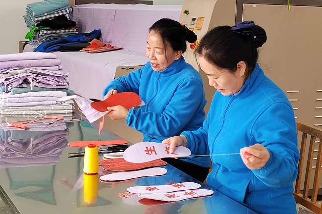 这一双双看似不起眼的鞋垫,制作起来却很繁琐,女工们要对废旧衣物进行仔细分类和筛选,挑选出材质柔软、舒适且完好无损的布料。接着,她们用一块平整的板子,将布块拼接在一起,刷上一层浆糊,层层叠加,直至四五层之厚,再将这些布晒干,变成制作鞋垫的原材料。然后,女工们依照鞋垫的模板,进行裁剪、包边处理,每一道工序都倾注了她们的心血。经过细致的缝制,一双双精美的鞋垫制作完成。