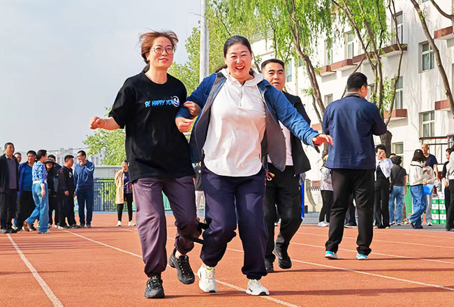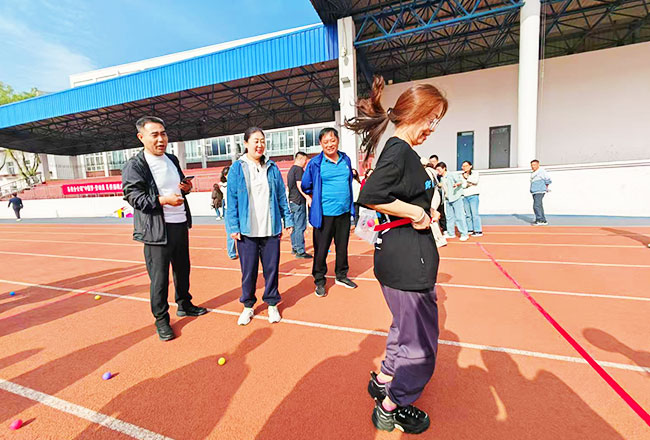 随着清脆的哨声响起,两人三足跑项目率先为比赛拉开序幕。队员们用绑带将相邻脚踝紧紧相连,从起步时跌跌撞撞的生涩,到后来默契十足地加速冲刺,“一二、一二”整齐划一的口号声响彻整个赛场。有的队伍因节奏失误险些摔倒,却在队友及时有力地搀扶下,迅速重整旗鼓,继续奋勇向前,充分彰显出不抛弃、不放弃的团队精神。
