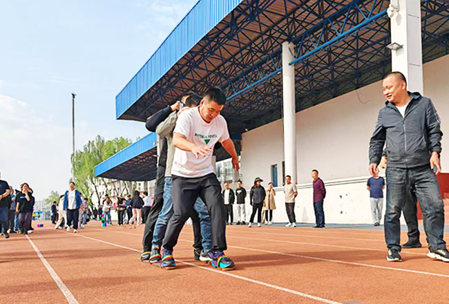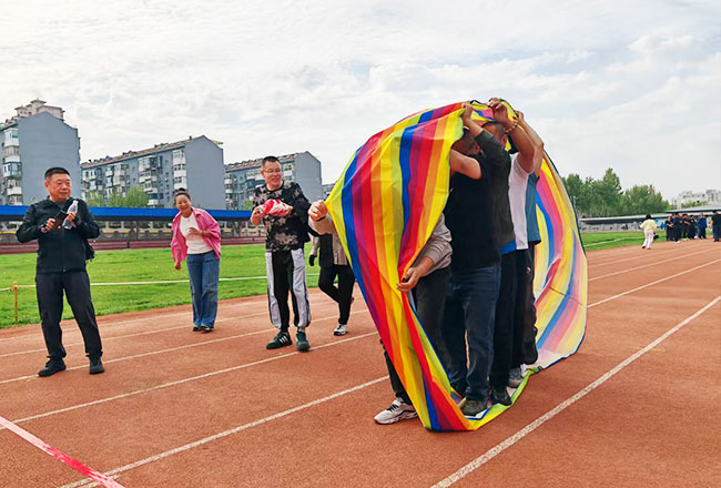 在三人木板鞋项目中,队员们双脚稳稳固定在木板上,宛如整齐划一的“巨人”,迈着稳健的步伐奋勇前行。他们步伐一致,口号响亮,凭借出色的协调配合,快速冲向终点。车轮滚滚项目同样精彩,队员们钻进“车轮”内,齐心协力推动“车轮”前进,充分展现出集体的力量与智慧。