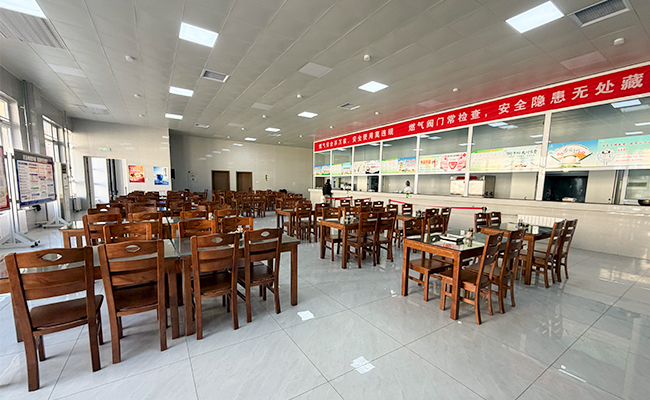 改造后的餐厅大厅宽敞明亮,崭新的餐桌椅整齐排列,数量大幅增加,有效缓解了以往就餐高峰座位紧张的状况,让职工能轻松惬意地用餐。同时,全新安装调试的洗碗机即将投入使用,可承担餐具清洗、消毒和烘干工作,职工无需再自带碗筷、洗碗,既节省时间,又提高了卫生标准,保障了饮食安全。此外,餐厅采用“明厨亮灶”设计,职工透过透明窗口可清晰地看到后厨从食材处理、烹饪到装盘的全过程,让每一顿饭都吃得安心、吃得放心。