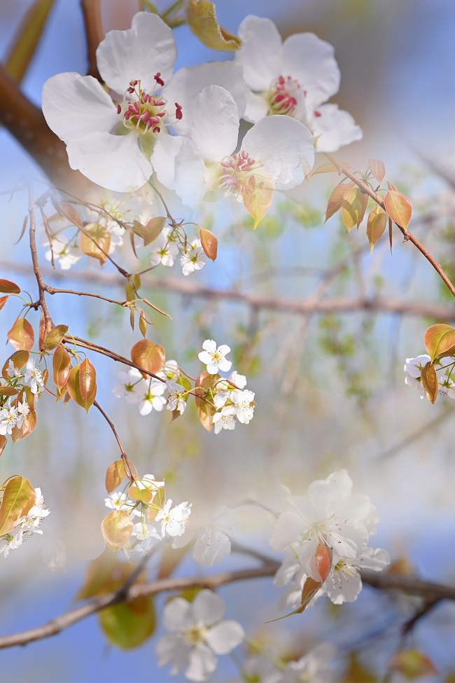 梨花如雪般绽放,阳光洒下,花瓣上泛起晶莹的光泽,空气中弥漫着淡淡的清香,引得蜜蜂在花间穿梭,为这春日画卷增添灵动之美。