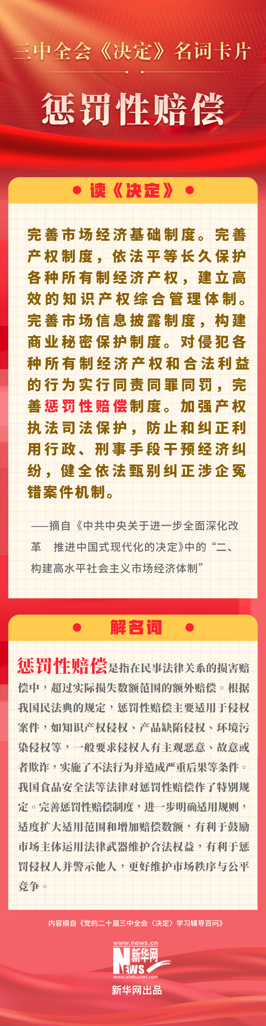 党的二十届三中全会审议通过了《中共中央关于进一步全面深化改革、推进中国式现代化的决定》。新华网依据《党的二十届三中全会〈决定〉学习辅导百问》,制作三中全会《决定》系列名词卡片,和大家一起来深入学习领会二十届三中全会精神。本期名词是“惩罚性赔偿”。